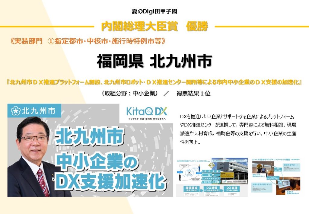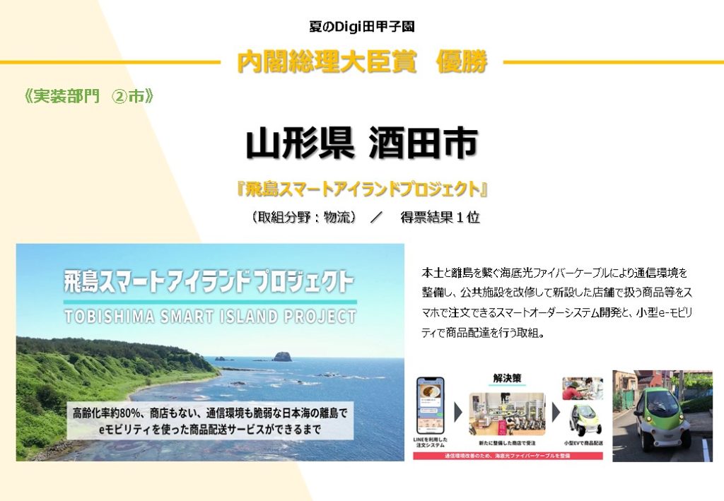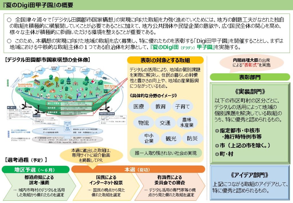 夏のDigi田甲子園とは、地方公共団体を対象として、デジタル技術の活用により、地域の課題を解決し、住民の暮らしの利便性と豊かさの向上や、地域の産業振興につながっている取り組みを総理大臣が表彰するもの。