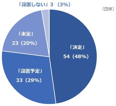 調査結果を見ると、取りまとめ担当部署の決定状況(n=113)については、「決定している」が54団体(48%)、「設置予定」が33団体(29%)、「未定」が23団体(20%)、「設置しない」が3団体(3%)となり、約8割が体制整備を進めていることが明らかとなりました。また、取りまとめ担当部署が「決定している」と回答した54団体のうち全体の約6割にあたる32団体が「会計部門」を挙げています。