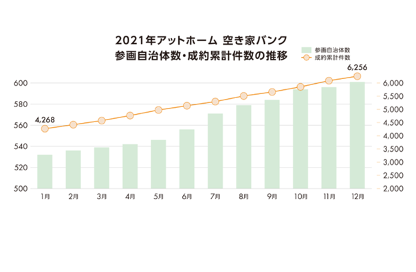 不動産情報サービスのアットホームは、2017年10月に開設した「アットホーム 空き家バンク」において、参画自治体数が600を超え、601自治体(2021年12月31日現在)になったことを公表した。同サービスは、国土交通省が推進している空き家・空き地等の流通活性化に向けた取組みに賛同し、アットホームが全国の空き家・空き地や公的不動産(PRE)、地域の情報と消費者ニーズを結びつけることを目的に構築・運営しているサイトである。