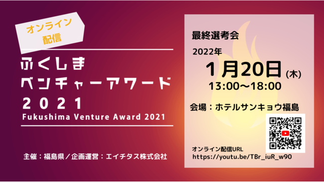 福島県は、エイチタス株式会社による企画運営のもと「ふくしまベンチャーアワード2021」を主催しており、今回最終選考会をオンライン配信により開催する。