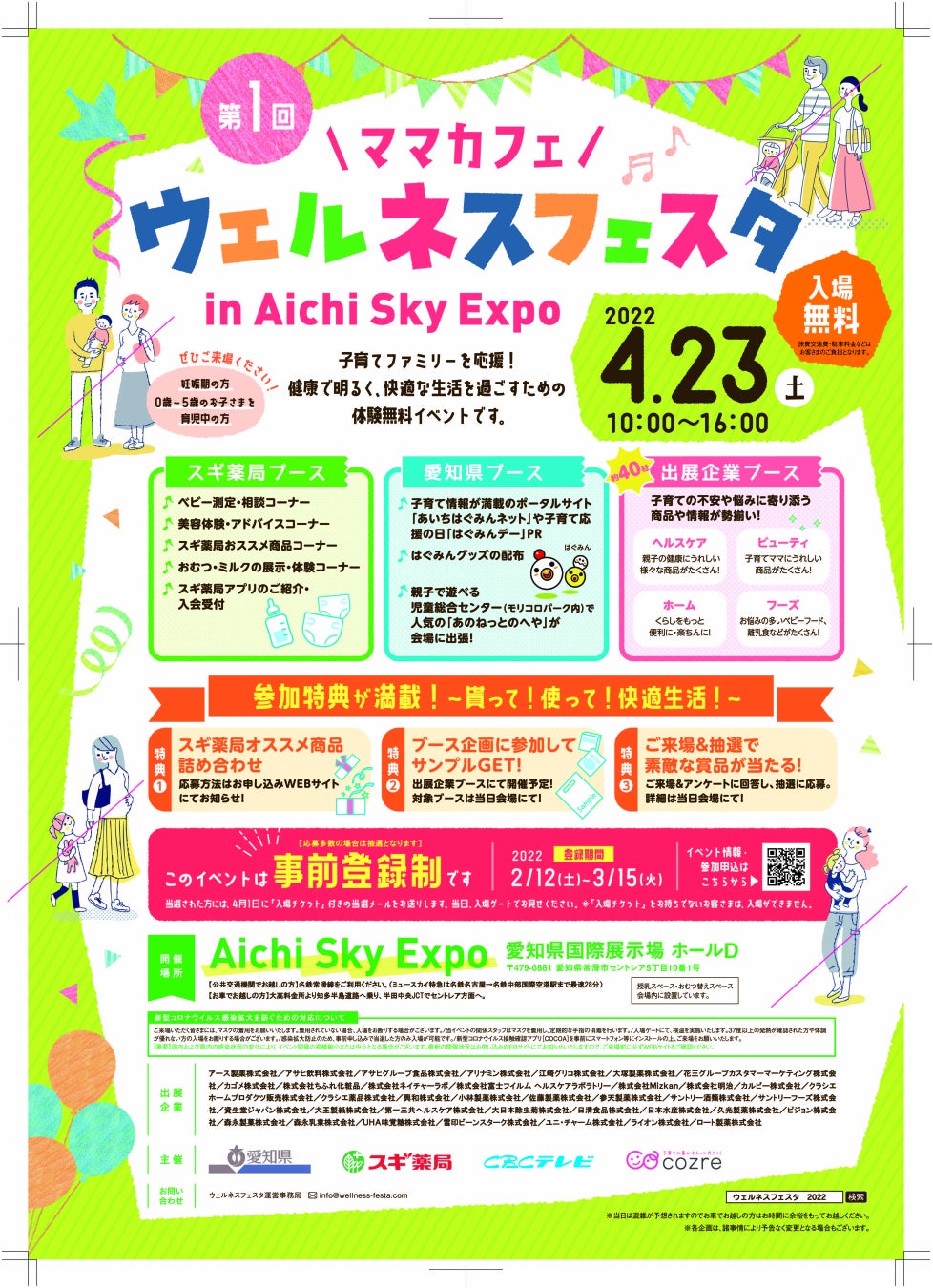 愛知県は、㈱CBCテレビ、㈱スギ薬局、㈱コズレとの共催で、子育てファミリーを応援するイベントを2022年4月23日(土)に常滑市のAichi Sky Expoで開催することを決定した。