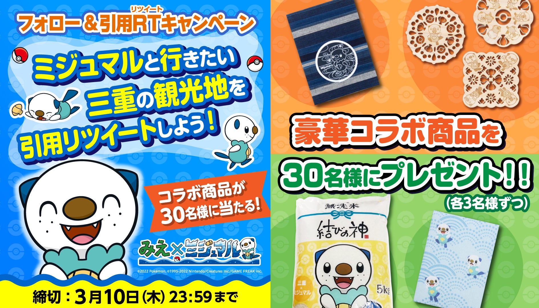 また今回「三重県×ミジュマル」の取組とともに、県内観光地の魅力とコラボ商品の魅力を広く紹介するために、以下のとおり2022年3月1日(火)から3月10日(木)までTwitterキャンペーンを実施している。