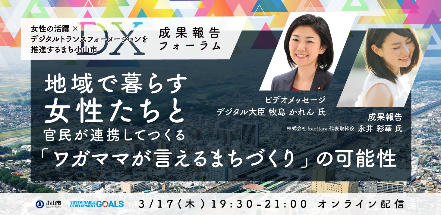 栃木県小山市は、「かえれる地元をつくる」をビジョンに据え、女性たちが暮らし続けたいまちづくりに自治体と共に取り組む株式会社kaettaraとともに、令和2年度から行ってきた「女性の活躍×デジタルトランスフォーメーションを推進するまち 小山市・成果報告フォーラム」事業の成果発表フォーラムを行う。