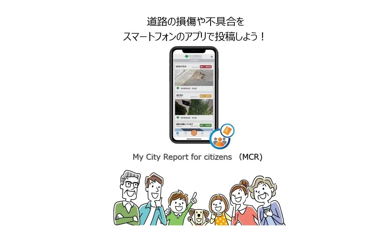 道路通報システムは、「My City Report for citizens(MCR)」というスマートフォンアプリを用いて、道路の損傷や不具合を発見した際に、スマートフォンのカメラとGPSを利用して、住民に簡単に投稿してもらう仕組みのもの。投稿された道路の損傷や不具合は、必要に応じて補修等を実施する。