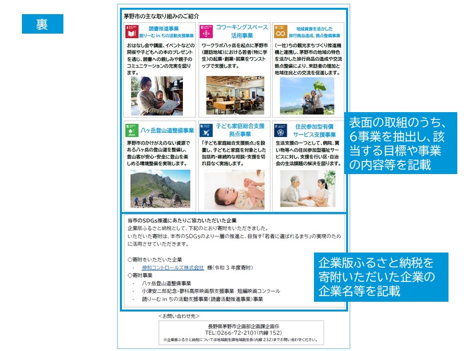表面の取り組みのうち6事業を抽出し、該当する目標や事業の詳細等や企業版ふるさと納税を寄附した企業の名称等を記載している。