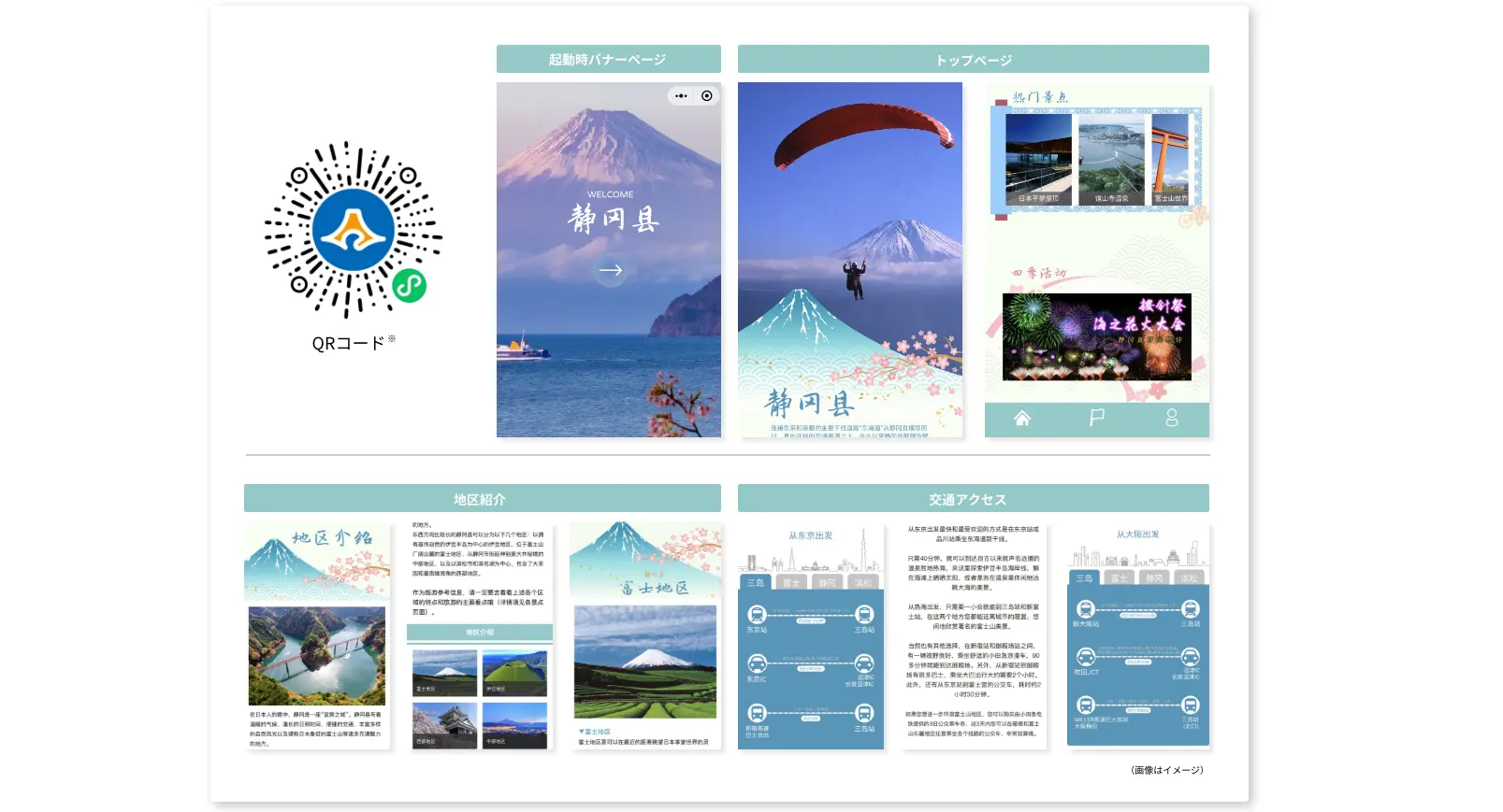 本ミニプログラムは中国からの観光客にも人気の富士山をモチーフにしており、富士山およびその周辺観光情報を入り口とし、観光地(三保松原・大室山など)、温泉地(修善寺や熱海など)、四季のイベント情報(静岡まつり・伊東按針祭<あんじんさい>など)、特産品紹介(静岡茶・桜えび・みかん・わさびなど)に至るまで、静岡県の魅力について深く知ってもらうことができる内容となっている。