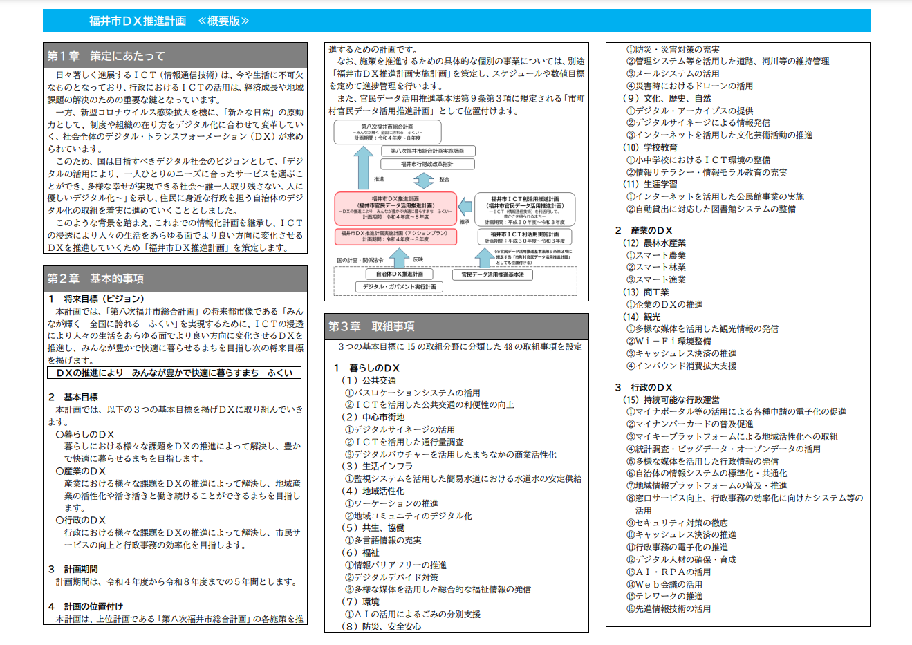 福井市は、ICTの浸透により人々の生活をあらゆる面でより良い方向に変化させるDX(デジタル・トランスフォーメーション)を推進していくため、「福井市DX推進計画」及びその具体的な事業計画である「福井市DX推進計画実施計画(アクションプラン)」を2022年(令和4年)3月に策定し、同市HPで公表している。