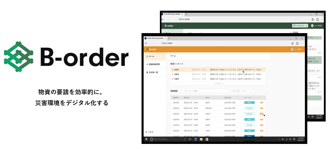「B-order」は災害時に自治体と企業・団体間で行われる支援物資要請をWebで効率化するサービス。災害時、多くの被災者に必要となる物資の供給は自治体から企業・団体に要請という形で行われる。支援物資要請は東日本大震災から11年が経つ現在もFAXや電話などの手段がメインとなっており、要請を依頼する方も受ける方も、非常に効率が悪く改善が図れていない状態となっている。
