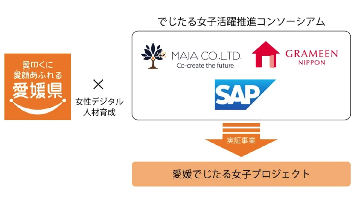 「でじたる女子活躍推進コンソーシアム」とは、株式会社MAIAと一般社団法人グラミン日本、SAPジャパン株式会社が、2022年5月15日に発足したデジタル技術を活用できる女性人材の募集から育成・教育および就労支援を一貫して行う連携組織。