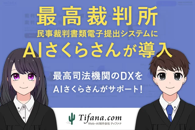 最高裁判所は、AIアバター接客「AIさくらさん」を導入。2022年5月30日より、最高裁判所が管理する裁判書類提出用のWebサイトにてカスタマーサポートとしての案内を開始した。AIさくらさんは、株式会社ティファナ・ドットコムが提供する、AIの力で世の中のDXを実現するクラウドサービス。