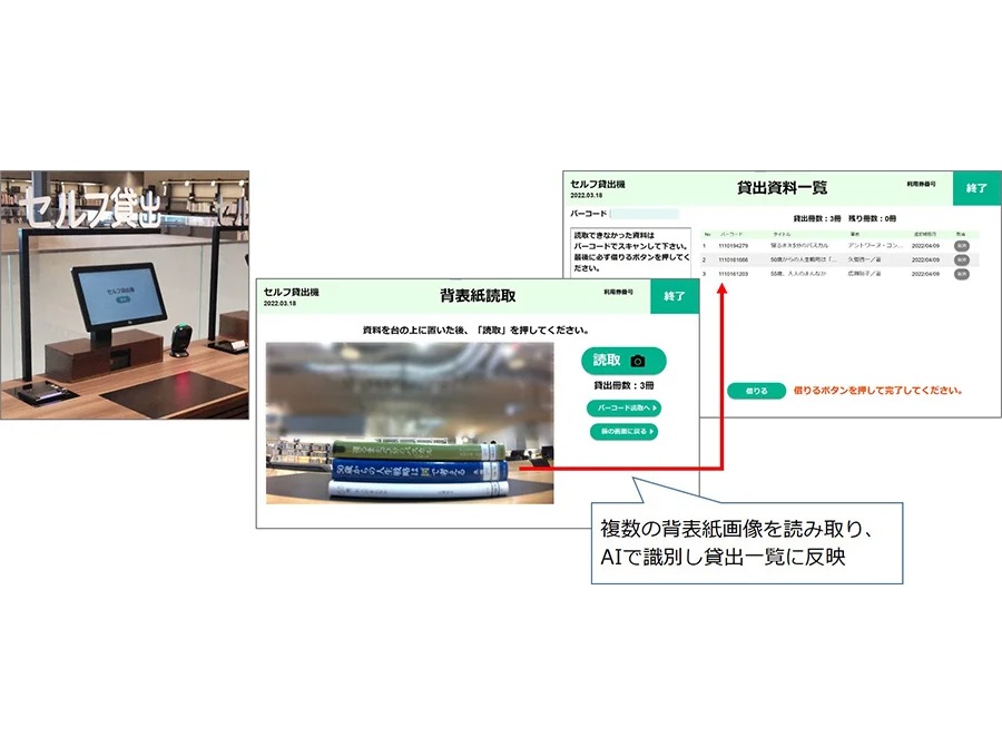 また、セルフ貸出機は利用者自身で貸し出し手続きを行えるシステム。セルフ貸出機をSHELF EYEの画像解析AIデータベースと連携させることで、背表紙画像から借りたい本を一括で識別することができ、画像解析AIによるセルフ貸出機はICタグを利用した貸出機と比較して約50%(※京セラコミュニケーションシステム株式会社調べ)のコストで導入することが可能。