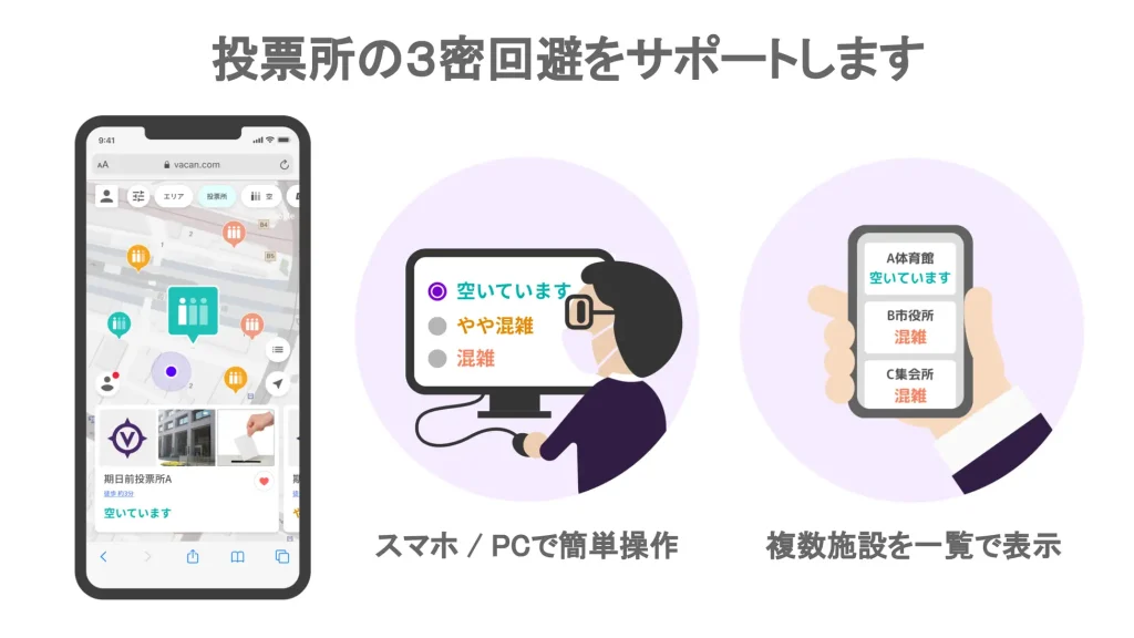 VACANには、マップ上で近くの施設等の空き・混雑状況を一覧できる「VACAN Maps」という機能があり、期日前投票者はこのVACAN MapsにPCやスマートフォン等でアクセスすることで、投票所の位置や混み具合を確認することができる。混み具合の情報は、期日前投票所の職員がインターネット上の管理画面から操作することで更新され、表示は「空いています」「やや混雑」「混雑」の3段階。
