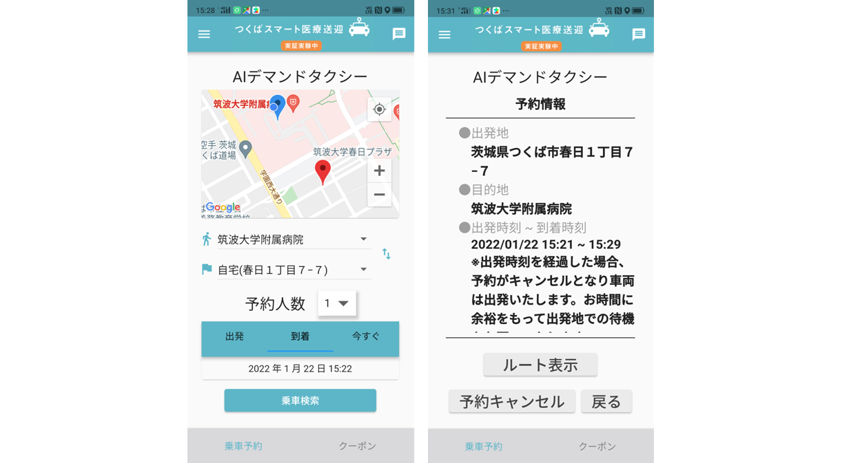 つくば市の中でも高齢化率の高い小田地区、宝陽台地区を中心に、これらの地区と病院の間に挟まれるエリアを実証エリアに定め、2台のタクシーで実証実験を行いました。約1か月の実証期間で延べ329名の住民にご利用いただきました。本実証では、これとは別に、携帯電話情報からの移動データの分析も行っており、データは匿名加工され、つくば市の交通施策に活用される予定です。