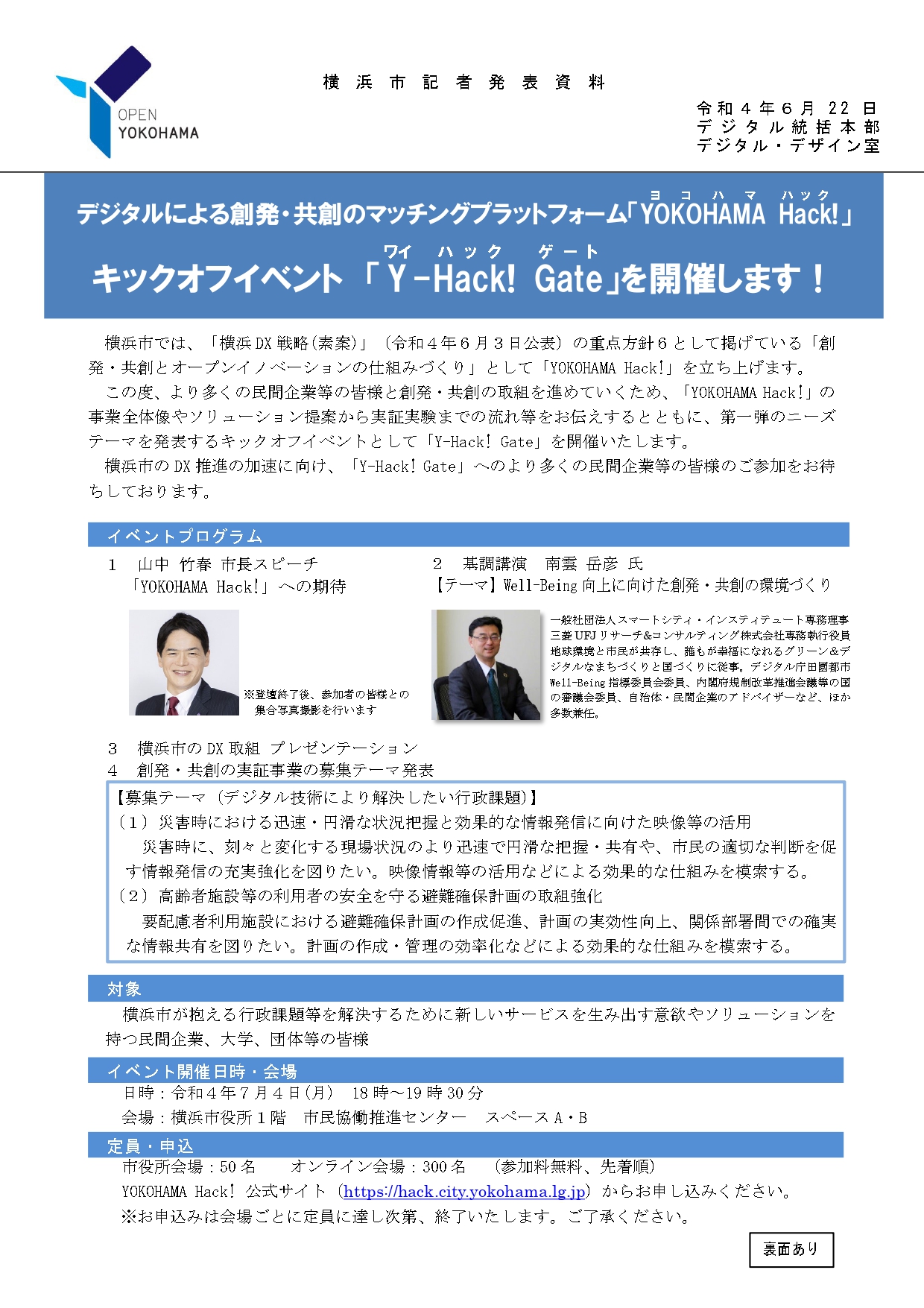 この度は、より多くの民間企業等の皆様と創発・共創の取組を進めていくため、「YOKOHAMA Hack!」の事業全体像やソリューション提案から実証実験までの流れ等を伝えするとともに、第一弾のニーズテーマを発表するキックオフイベントとして「Y-Hack! Gate」を開催することとなった。