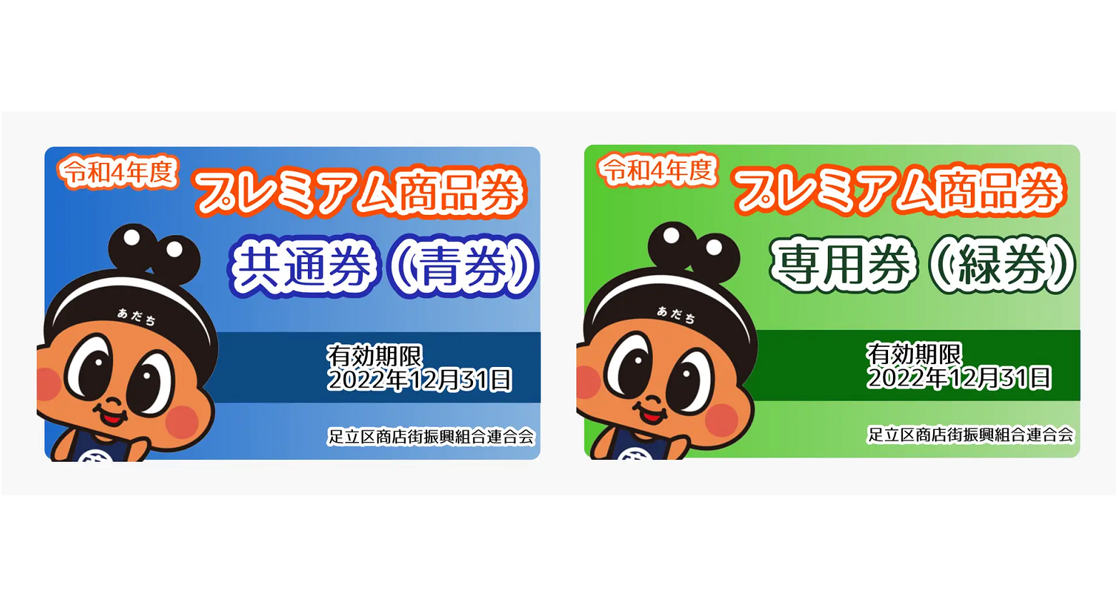 特別協力店を含む全ての対象加盟店舗で使える「共通券(青券)」と、特別協力店のみでしか使えない足立区内共通商品券取扱登録店舗で使用できる「専用券(緑券)」の2種類があり、地域内の隅々における消費活性化を促す。