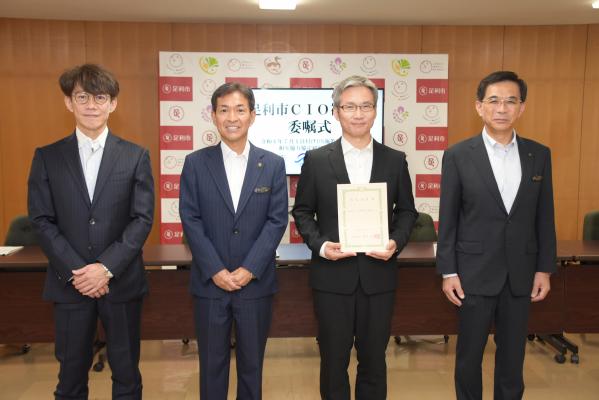 7月1日、CIO補佐官の委嘱状交付式が市庁舎で行われ、足利市長・早川尚秀氏、足利副市長・塚原達哉氏(CIO)、AeroEdge株式会社代表取締役社長・森西淳氏、同社執行役員・徳永昌宣氏が出席した。