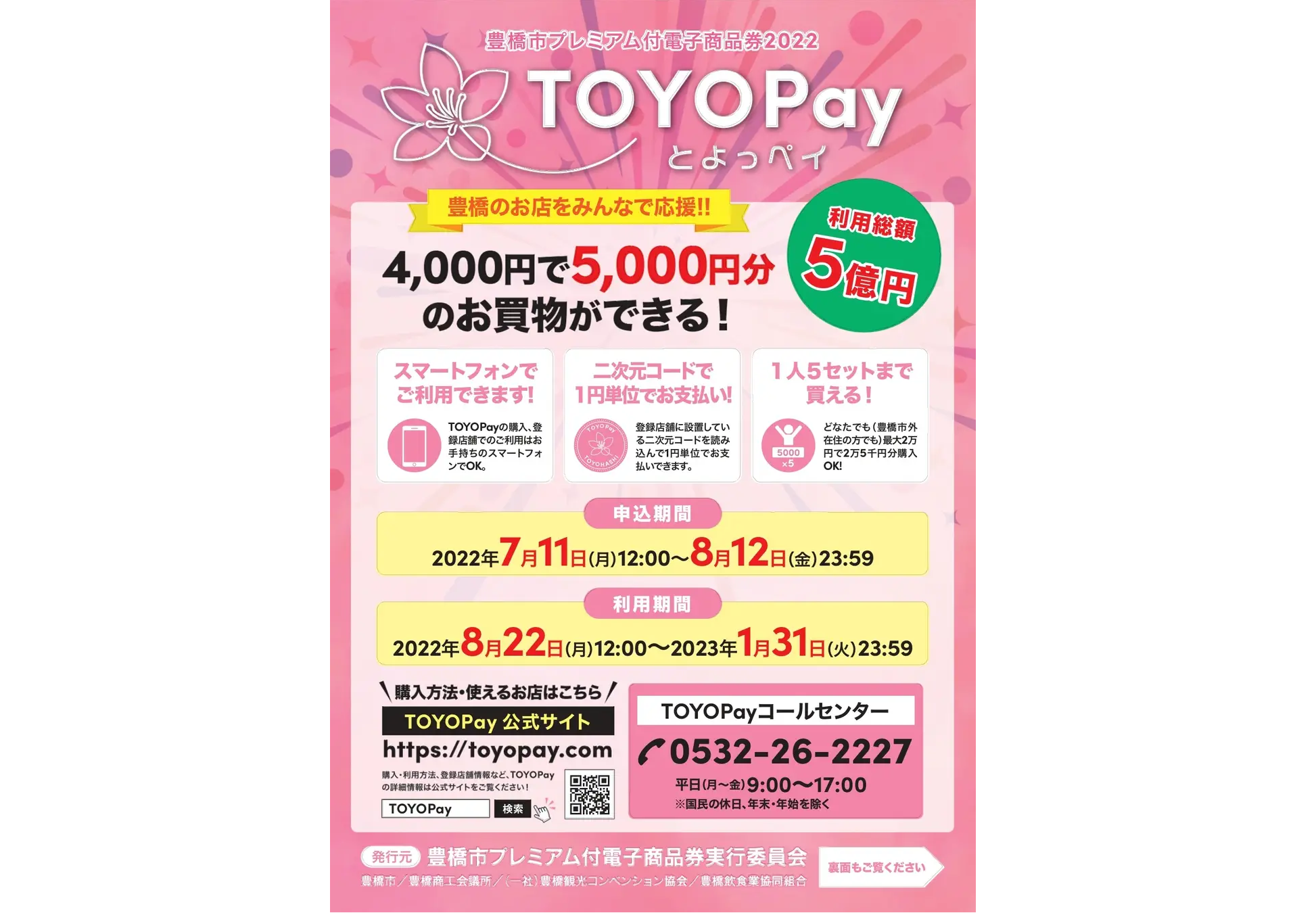 豊橋市では、市内事業者への支援と感染症対策を両立させるため、申込から利用までをスマートフォン1台で行える「豊橋市プレミアム付電子商品券2022「TOYOPay(とよっペイ)」を実施する。今回は、キャッシュレス決済を使用したことのない高齢者等のためにサポート窓口も開設。7/11(月)12:00から購入申込を開始する。