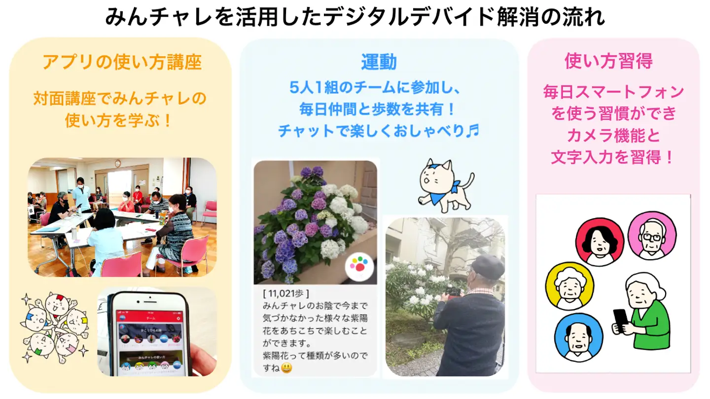 みんチャレは勉強・ダイエット・運動・糖尿病改善・など同じ目標を持った匿名の5人でチームを作り、チャットに報告して励まし合うことで楽しく習慣化に取り組むことができるアプリ。本事業では、墨田区の老人クラブ向けにみんチャレの使い方講座を実施。高齢者は、みんチャレを活用して地域の仲間同士5人組のチームに参加し、毎日写真とコメントを投稿して仲間と交流することで、楽しみながら文字入力とカメラ機能が習得できるようになる。昨年墨田区が実施したスマホ講座の結果より、高齢者がスマホ操作を覚えるためには、基礎的な講座に加えてスマホを日常使いする機会を提供することが必要とわかり、この度みんチャレの導入にいたった。