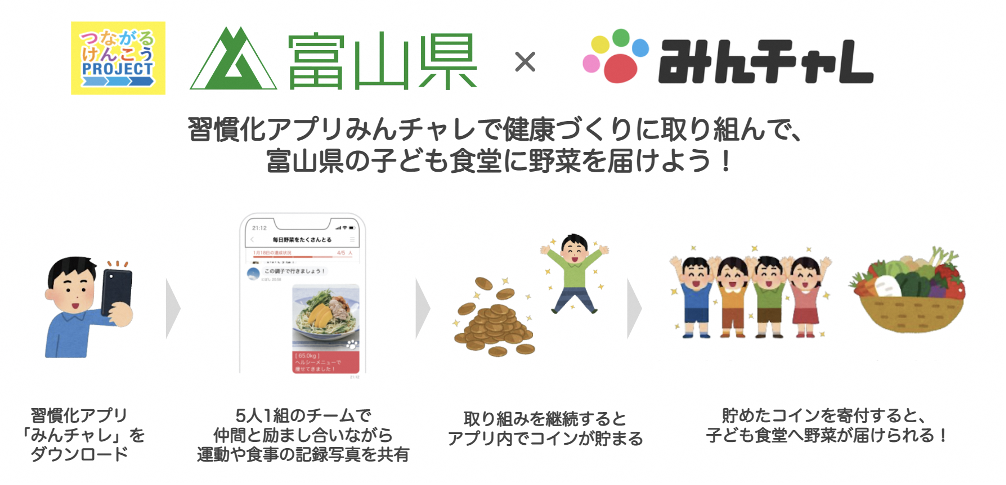 富山県は、習慣化アプリ「みんチャレ」を開発するエーテンラボ株式会社と、みんチャレを活用した健康支援事業「みんチャレHealthcare」による若年層向けの生活習慣の改善事業を11月1日より開始する。