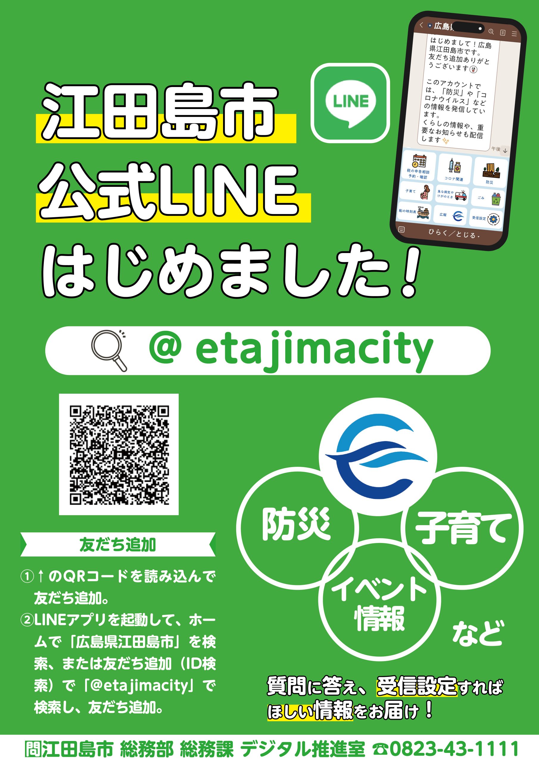参考:江田島市公式LINEアカウントを開設しました|江田島市役所ホームページ (city.etajima.hiroshima.jp)