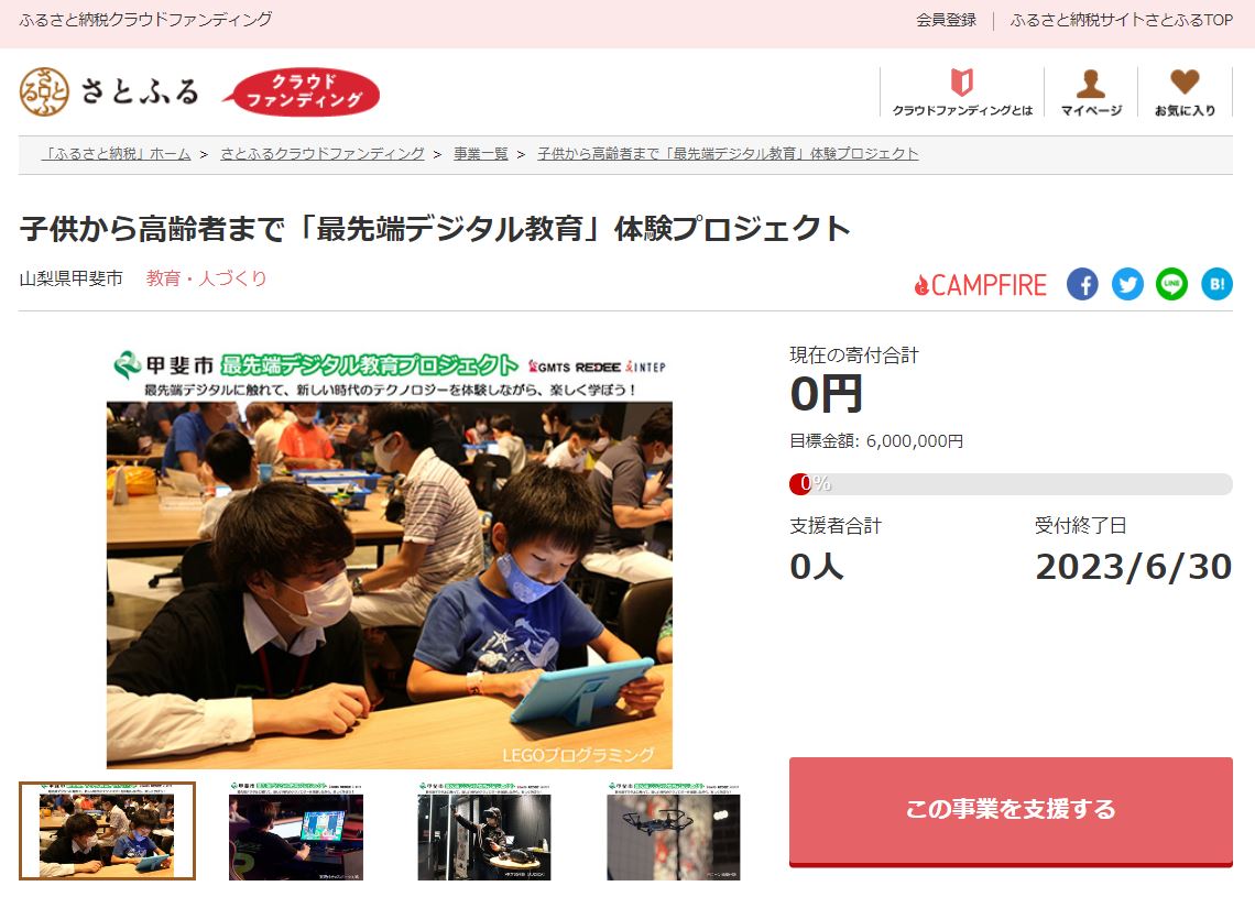 山梨県甲斐市はデジタル教育の普及を目的とした体験イベント開催に向けて、2023年4月21日から6月30日まで600万円を目標に寄付を募集している。寄付の受付は、株式会社さとふるが運営する「さとふるクラウドファンディング」にて行われている。