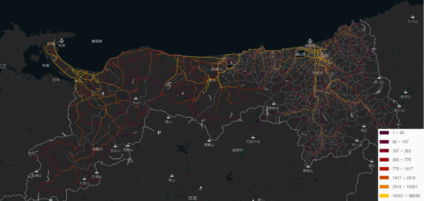 鳥取県は同社からGEOTRA Activity Data(交通流再現データ)を提供してもらい、地域における交通課題を分析・評価した。ビッグデータを利用して交通量を把握し、交通渋滞の原因を特定する狙いだ。