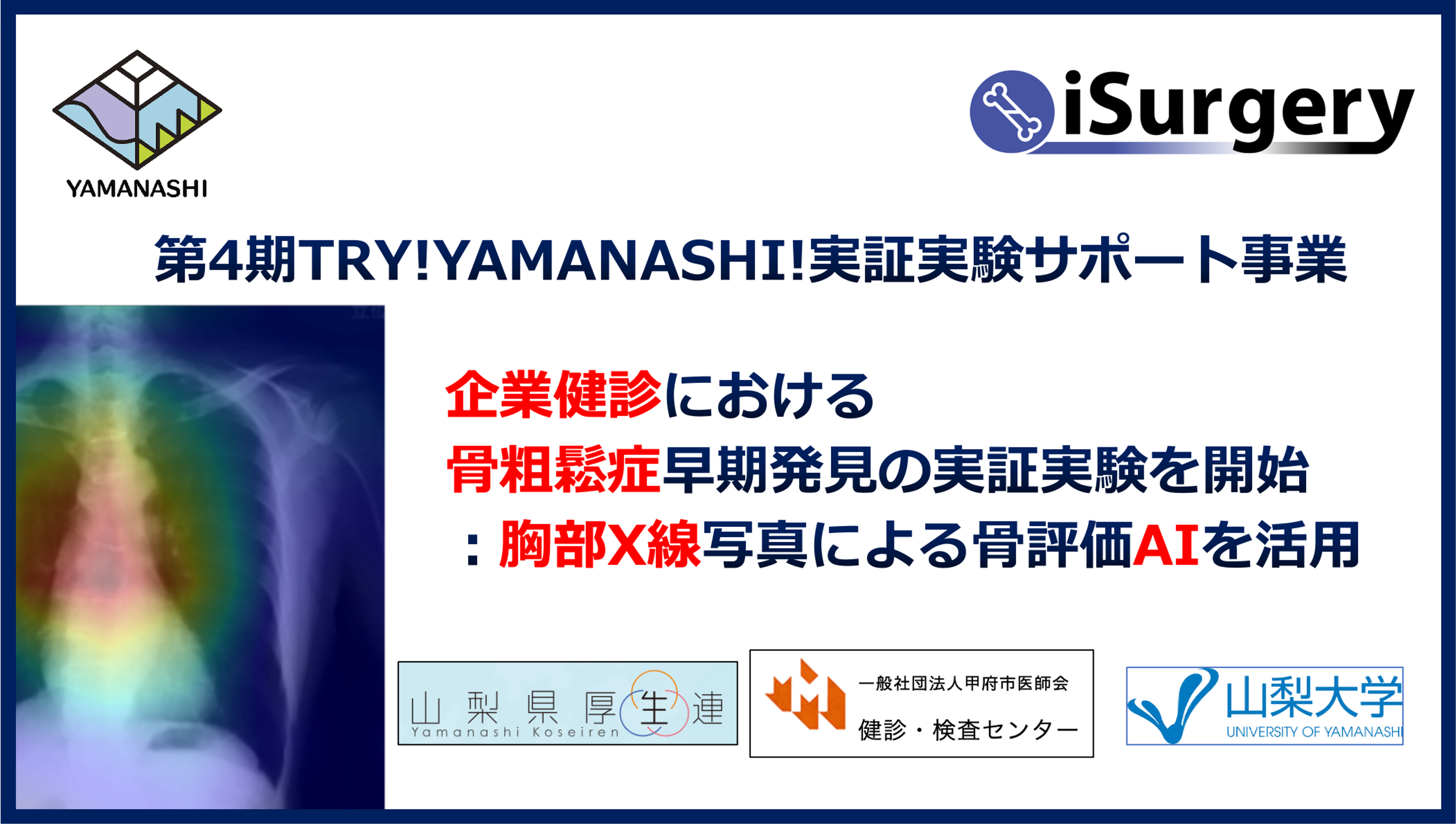 外部企業「iSurgery株式会社」と山梨大学が手を組み、県民の健康意識向上と骨粗しょう症の早期発見を行う。また、今回の実証実験で得られた結果は、学術的記録として学会や論文で発表される予定。