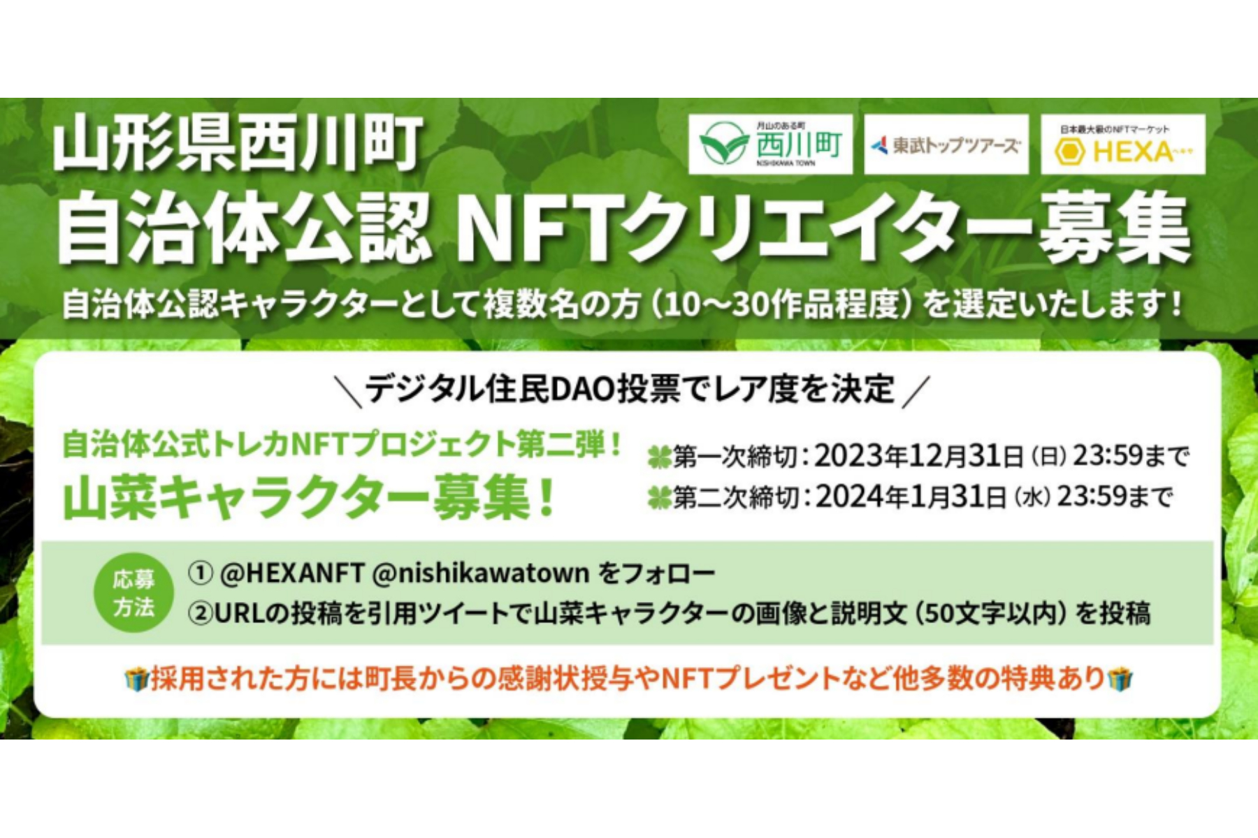 山形県西川町は、自治体公式 NFT トレカプロジェクト第二弾として「西川町山菜トレカ NFT」の公認 NFT クリエイターを募集する。なお、NFTマーケットのHEXA(ヘキサ)と、西川町の地方創生事業を協働する東武トップツアーズ株式会社が企画の全面協力を行う。