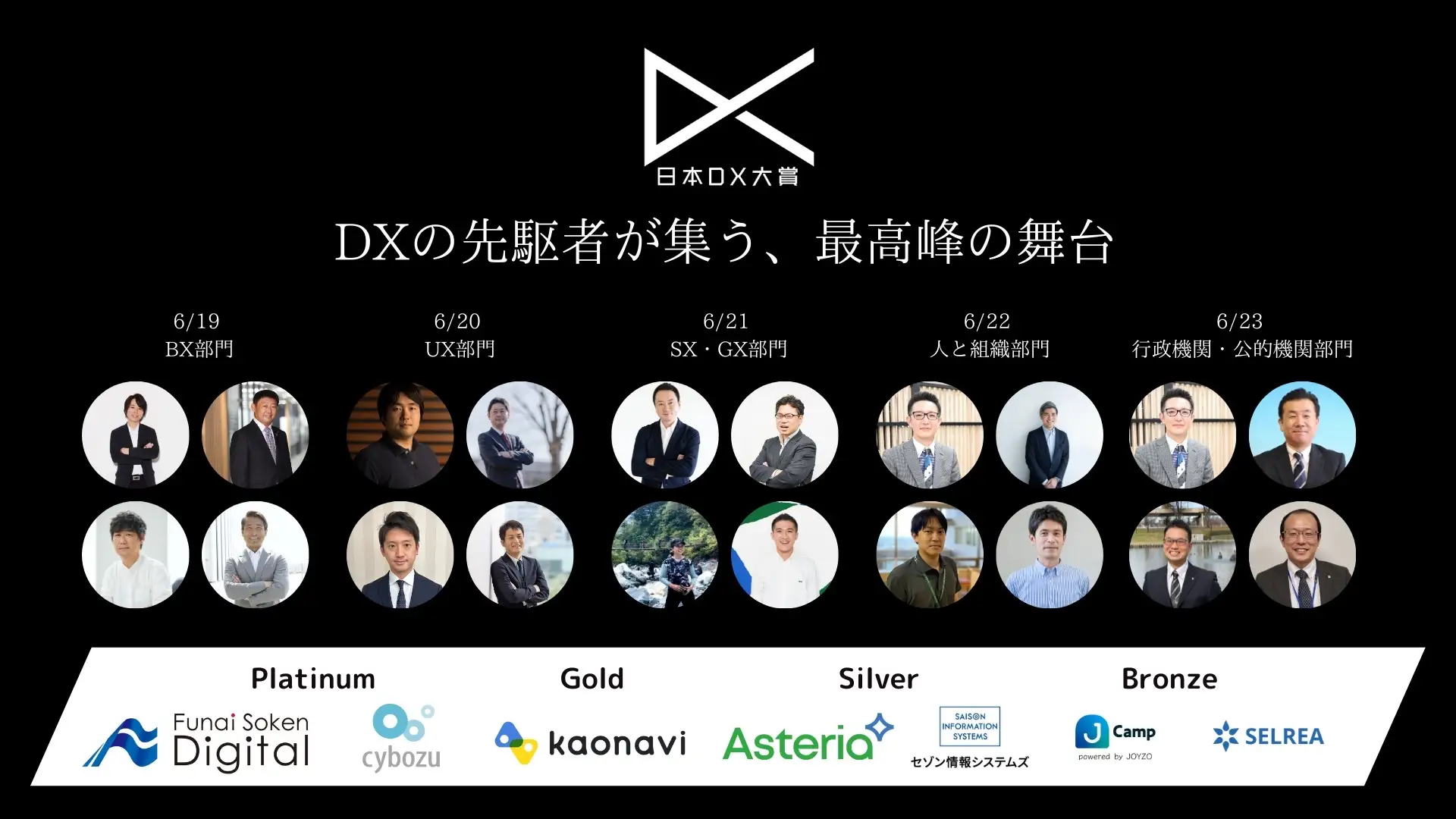 決勝大会では、「BX(ビジネストランスフォーメーション)」、「UX(ユーザーエクスペリエンス)」、「SX・GX(サステナビリティトランスフォーメーション。グリーントランスフォーメーション)」、「人と組織」、「行政機関・公的機関」の5つの部門別に大賞および優秀賞を決定する。