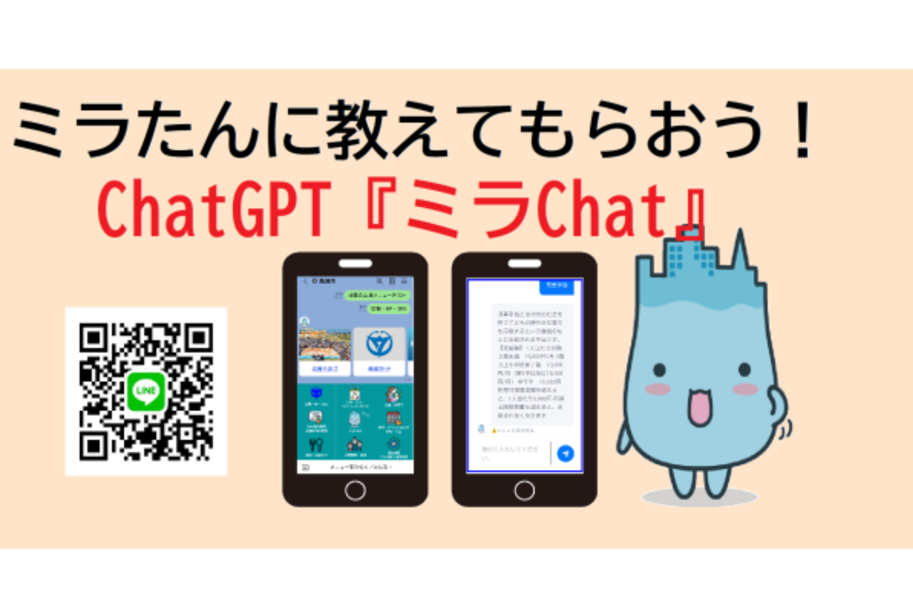 ミラChatは魚津市の各種行政手続きについて学習したChatGPTである。魚津市イメージキャラクターのミラたんが市役所の手続きの不明点や疑問点について情報を提供する形となる。