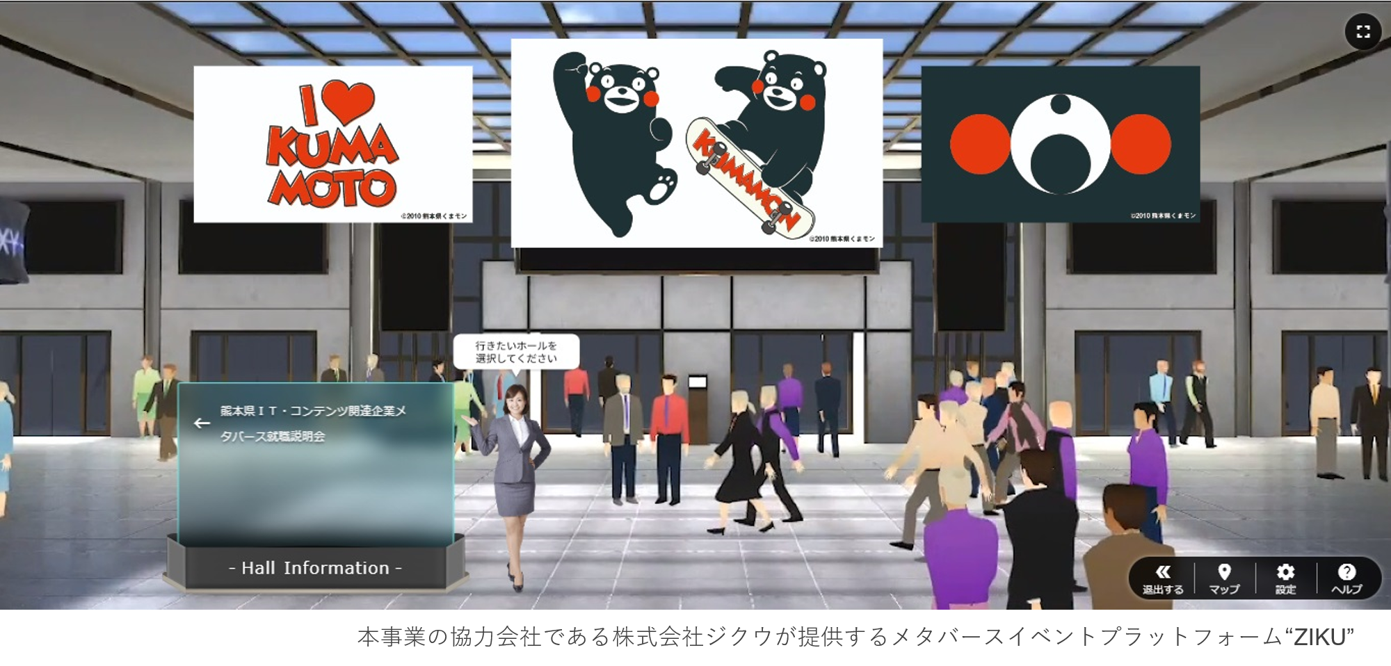 さらに、学生と熊本県に事業所を持つIT・コンテンツ関連企業をつなぐオンライン就職合同説明会をメタバース上で行う。参加する学生はアバターを用いて、出展企業のブースを訪れて情報を閲覧したり、企業説明会に参加できる。