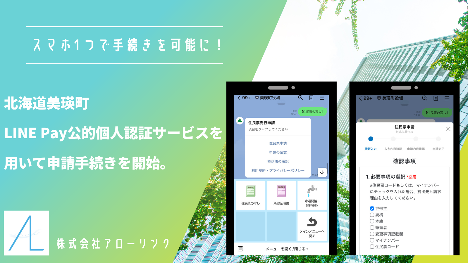 北海道美瑛町は、LINEの公式アカウントから住民票と所得証明書の申請手続きを行えるようにする実証実験を開始した。これにより、LINE Payの「公的個人認証サービス」を利用しての本人確認が可能となる。