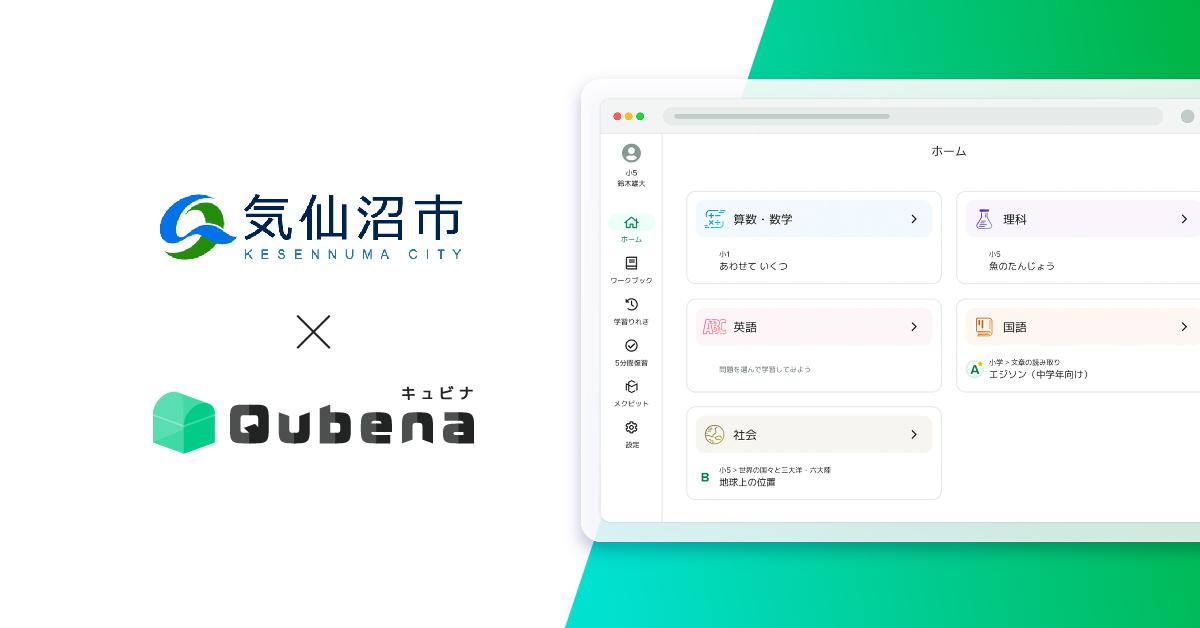 宮城県気仙沼市は、株式会社COMPASSが提供する学習eポータルおよびAI型教材「キュビナ」を全市立小中学校へ導入した。小学1年生から中学3年生までのおよそ3,200人が対象で、2024年度より利用を開始している。