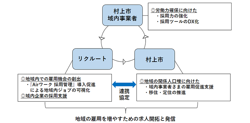 新潟県村上市は、地域活性化における雇用促進および人口定着に関する連携協定を、株式会社リクルートと締結した。これに伴い、同社が提供する「Airワーク採用管理」の導入を決定した。
