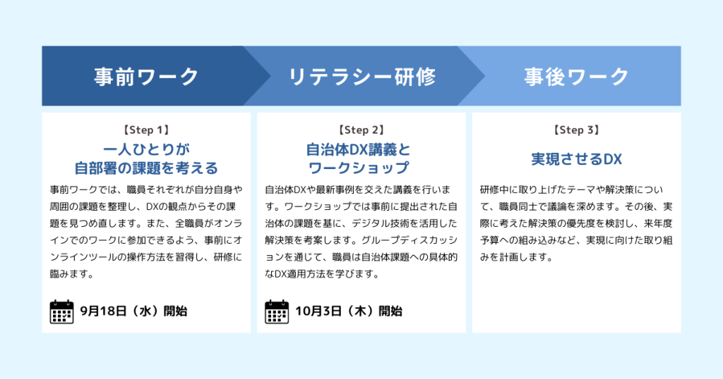 本研修は、自治体のDXを進めるため、職員の基礎知識・DXスキルの向上を図るもの。