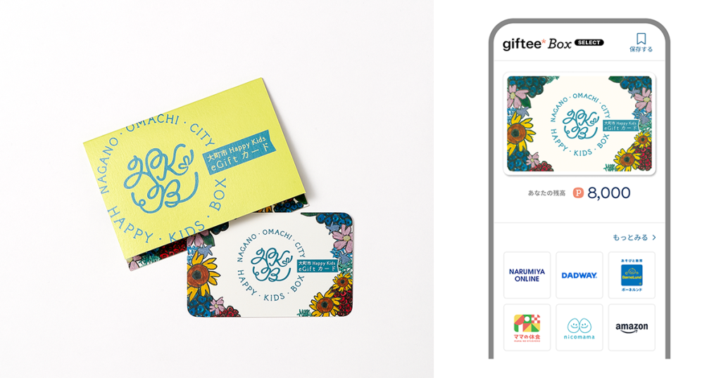 「大町市 Happy Kids eGift」は、デジタルギフトを活用した法人および自治体向けサービス「giftee for Business」の主力プロダクト「giftee Box®」を大町市仕様にカスタマイズしたカードタイプのデジタルギフトボックスである。本ギフトは2025年1月20日(月)より対象世帯への配送が開始される予定。