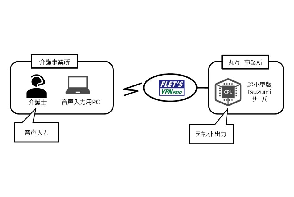 従来の手入力での記載業務に代わり、ノートパソコンから音声で報告内容を入力して文字化する「校正」、認識した言葉を適切な項目に仕分ける「仕分け」を行って介護記録として自動記録する。