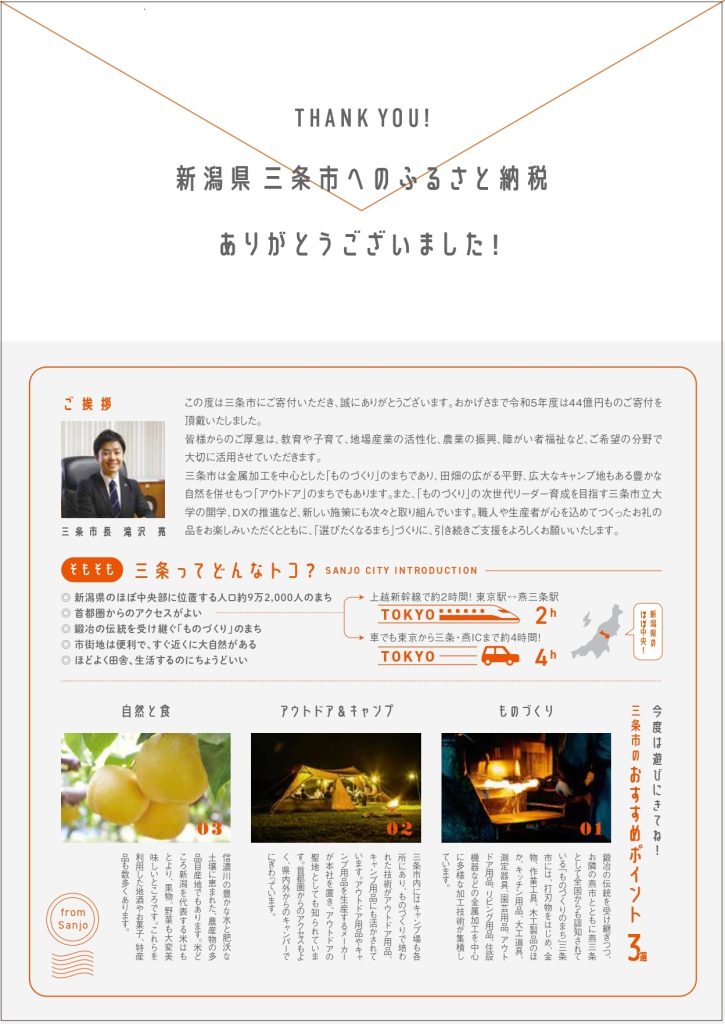 「体験型の返礼品に関しては、昨年度1000件ほど申込がありました。数は少ないかもしれませんが、間違いなく三条市に来ていただくきっかけになっているので、今後も体験型の返礼品を用意し、まちのファンになってくださる方を増やしていくことが、リピーターの獲得につながると考えています。また、事業者様の方で寄附者に送る返礼品の中に感謝のお手紙や製品の使い方などを同封している方もいます。そういった細かい部分も三条市が寄附者から選ばれる一つの理由だと思います」