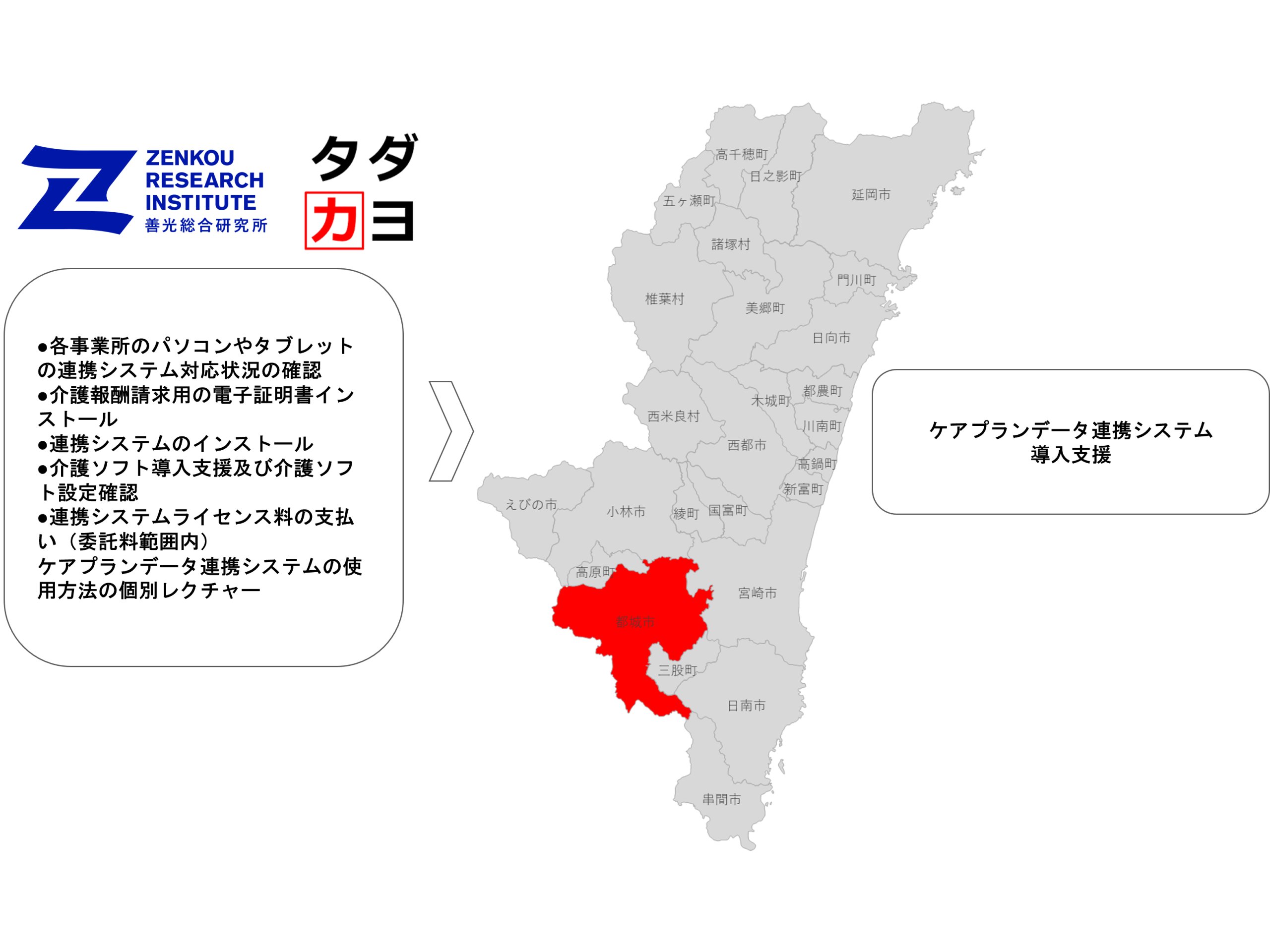 宮崎県は、「ケアプランデータ連携システム活用促進モデル地域づくり支援事業」を株式会社善光総合研究所に委託している。