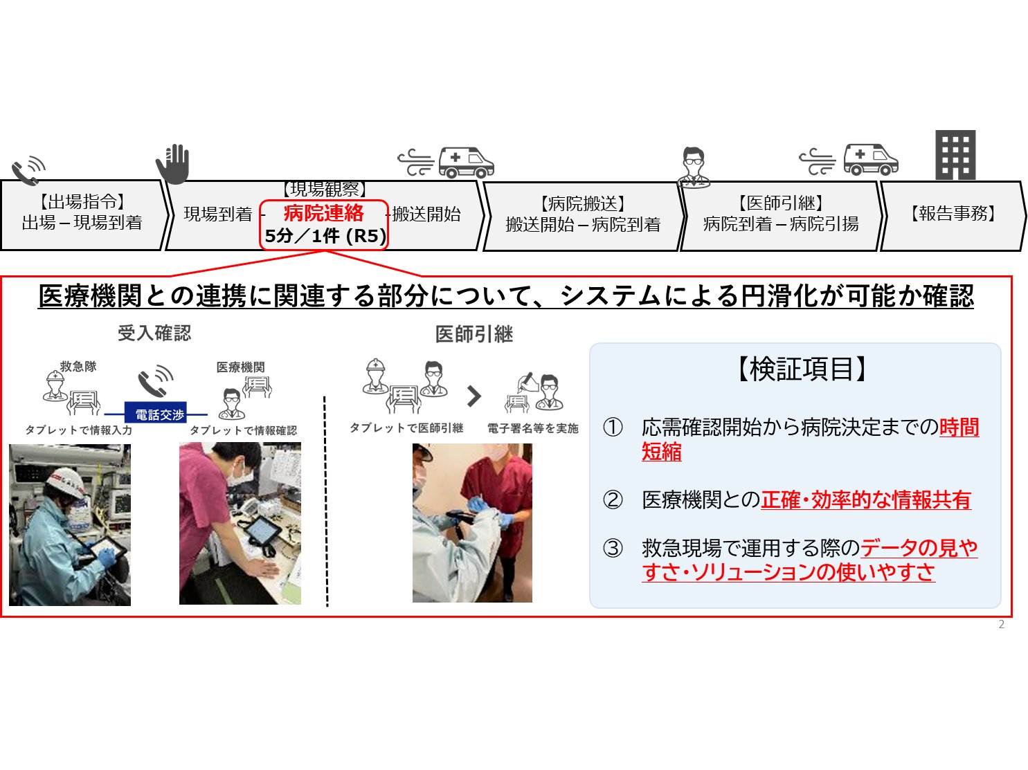 使用システムや搬送先によって差はあったものの、今回の取り組みによって病院決定時間を最大1分(約18%)短縮できた。