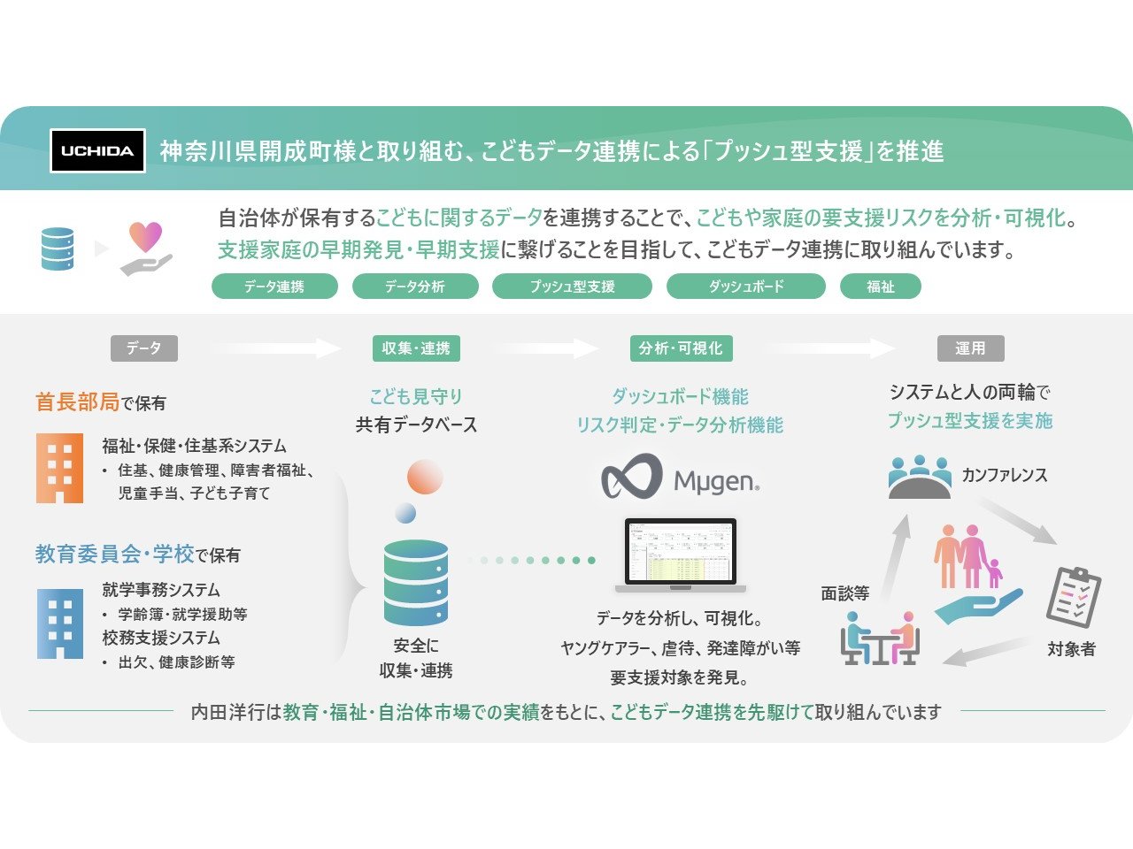 福祉や教育分野に点在する子どもに関するデータを個人情報に配慮しつつ収集・連携し、課題ごとに定められた指標によってデータを分析して可視化する。