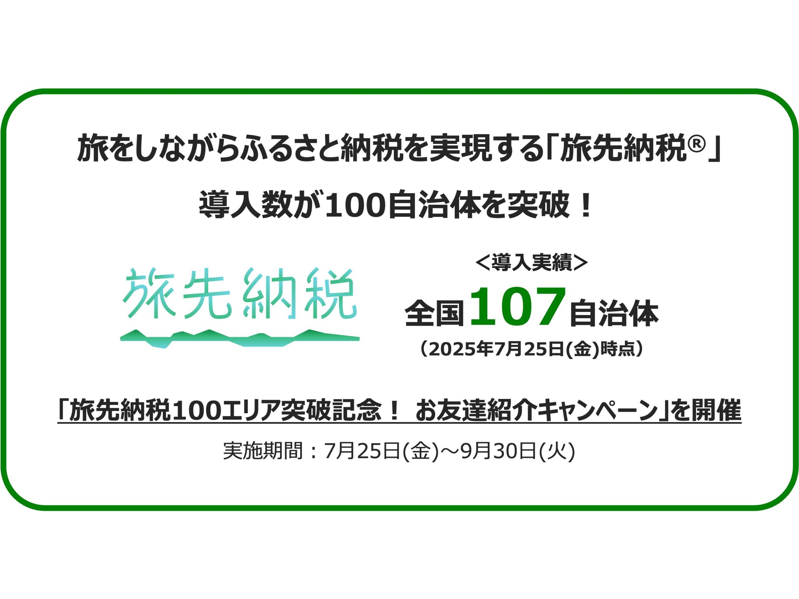 旅をしながらふるさと納税ができる「旅先納税®」を導入した自治体が100を超え、2025年7月25日時点で107に達した。この記念として、紹介者と被紹介者の双方にデジタルギフト「giftee Box select」1,000ポイントを贈呈する「旅先納税100エリア突破記念! お友達紹介キャンペーン」が、2025年7月25日から9月30日まで開催される。