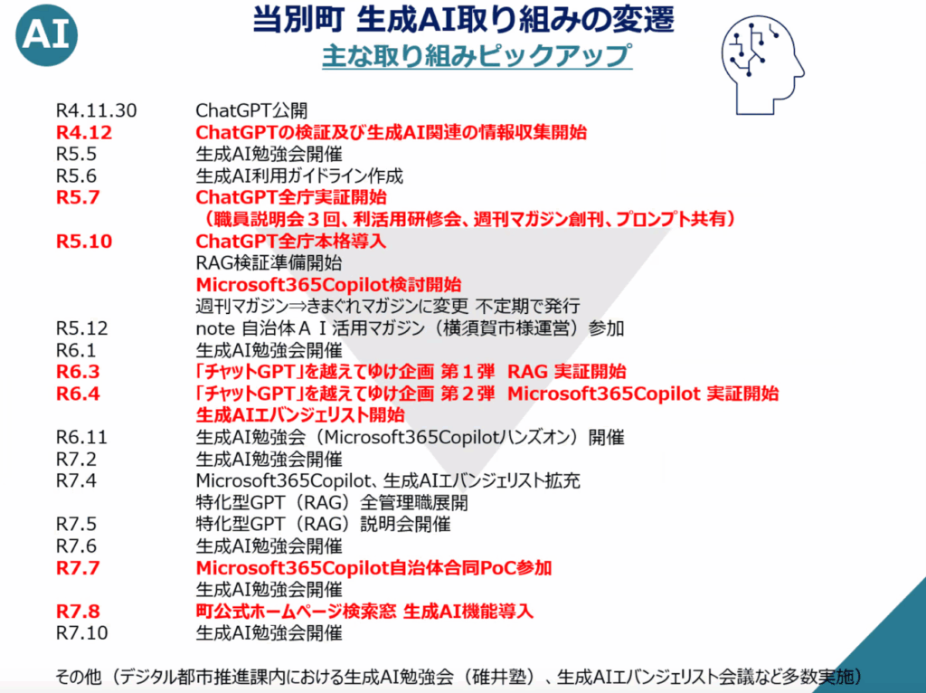ChatGPTが公開された翌月、2022年12月より早速、ChatGPTの検証と生成AI関連の情報収集をスタートした当別町。その後、2023年7月に全庁実証、同10月に全庁本格導入。北海道では一番最初だった。2024年3月にはRAG(検索拡張生成)の実証を、同4月にはMicrosoft365Copilot の実証をそれぞれ開始。同時に生成AIエバンジェリスト(伝道師)の設置も決定した。
