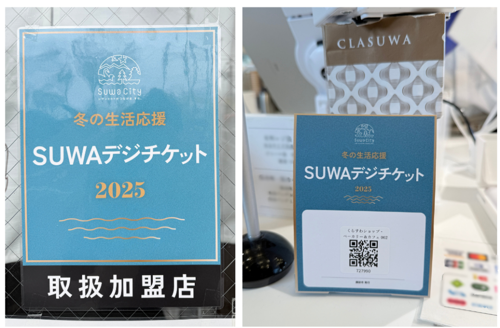 (左)加盟店店頭のポスター (右)加盟店レジに設置されたSUWAデジチケット決済QRコード