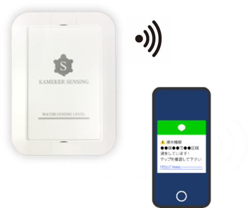 この度福知山市が導入を行ったのは、亀岡電子株式会社が開発を行った、セルラー通信式浸水検知センサ(KAMEKER3)。任意の場所に設置したセンサが浸水を検知すると、あらかじめ登録したユーザーを対象にLINEでお知らせするとともに、地図上で浸水地点を見える化するものとなる。