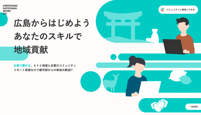 HIROSHIMA SATOYAMA WORK COは、広島県の里山(里海)と呼ばれる11のエリアでビジネス(仕事)をきっかけに地域のアップデートに取り組む、ヒト・地域・企業がつながるオンラインコミュニティ。オンライン上で展開されるコミュニティのため、都市部や県外に住んでいる人も、スキルを生かして地域貢献をすることができる。