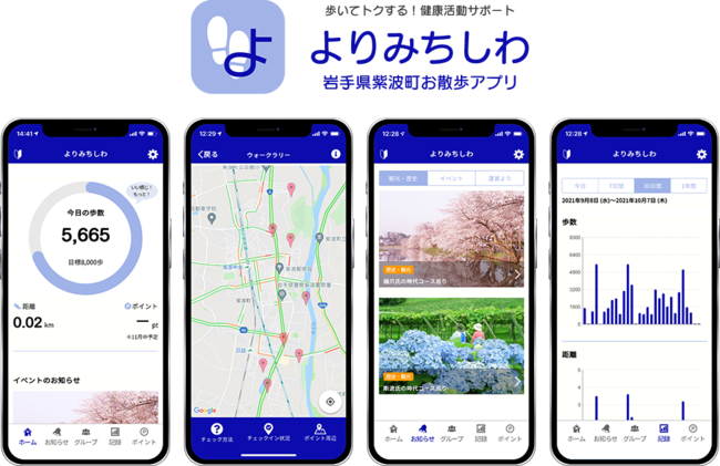 「よりみちしわ-お散歩アプリ」は紫波町周辺を「歩く」とポイントが貯まる、健康活動サポートアプリ。歩数や距離が記録され、毎日の活動記録をグラフで振り返ることもできる。