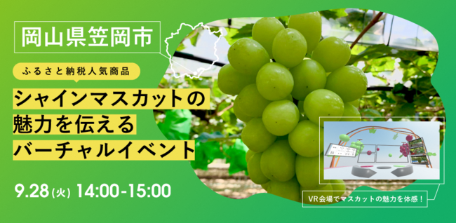 本イベントのテーマは、ふるさと納税品のシャインマスカット。コロナ禍で観光客も観光消費も減少の一方で、ふるさと納税への関心は上昇傾向となっており、岡山の果物の代表シャインマスカットを通して、笠岡市を知ってもらいたいとの思いから選定された。また、VR空間でのふるさと納税をテーマに交流イベントを行うのは、自治体初の取組となる。