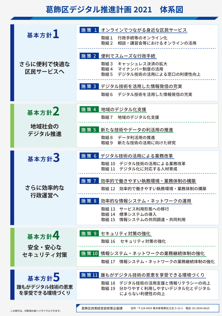 なお、葛飾区デジタル推進計画2021概要版(URL)によると、本計画では下記の5つの基本方針を掲げている。
