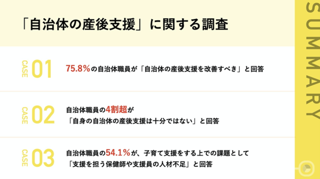 この調査により、自治体の産後支援が「不十分」と感じる自治体職員が多く存在することもわかった。資金的な援助の不足が仕事復帰への焦燥感を呼び、それらが育児のモチベーション低下に繋がっているという負の連鎖も明らかになっている。「自治体の産後支援を改善すべき」と多くの自治体職員自身も認識しており、より多面的な産後支援への改善が求められている。
